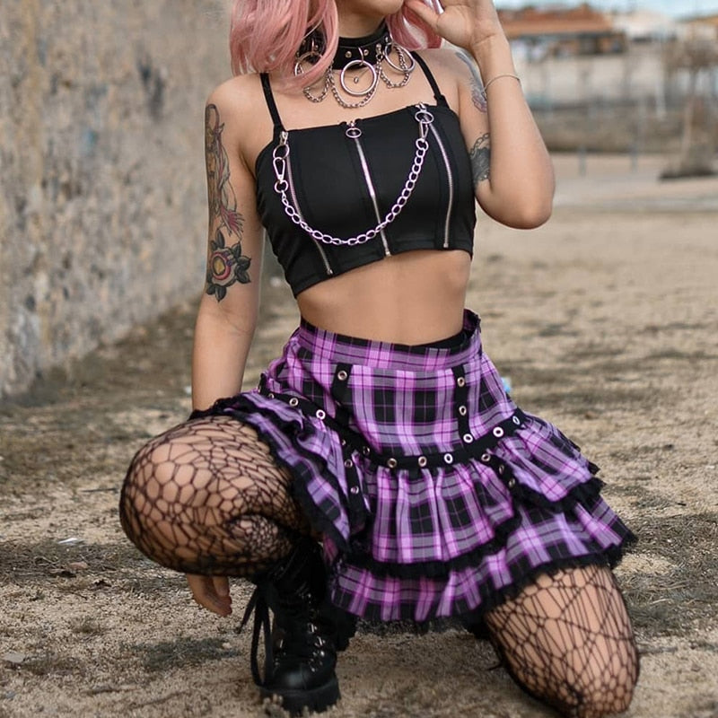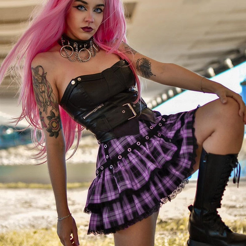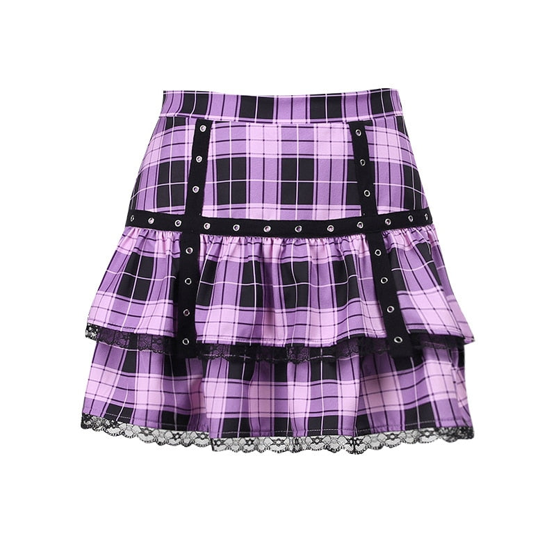 InsGoth Punk Y2K Purple Mini Skirt Mall Goth High Waist Plaid Pleated Skirts Harajuku E Girl Techwear  Lace Trim A Line Skirt