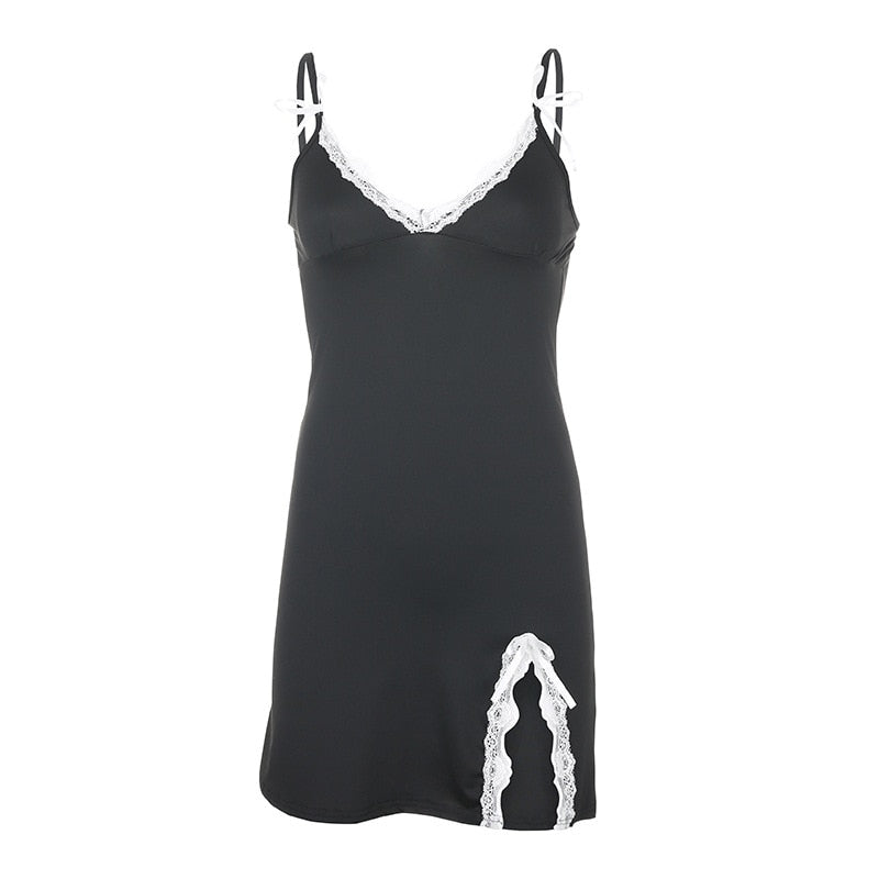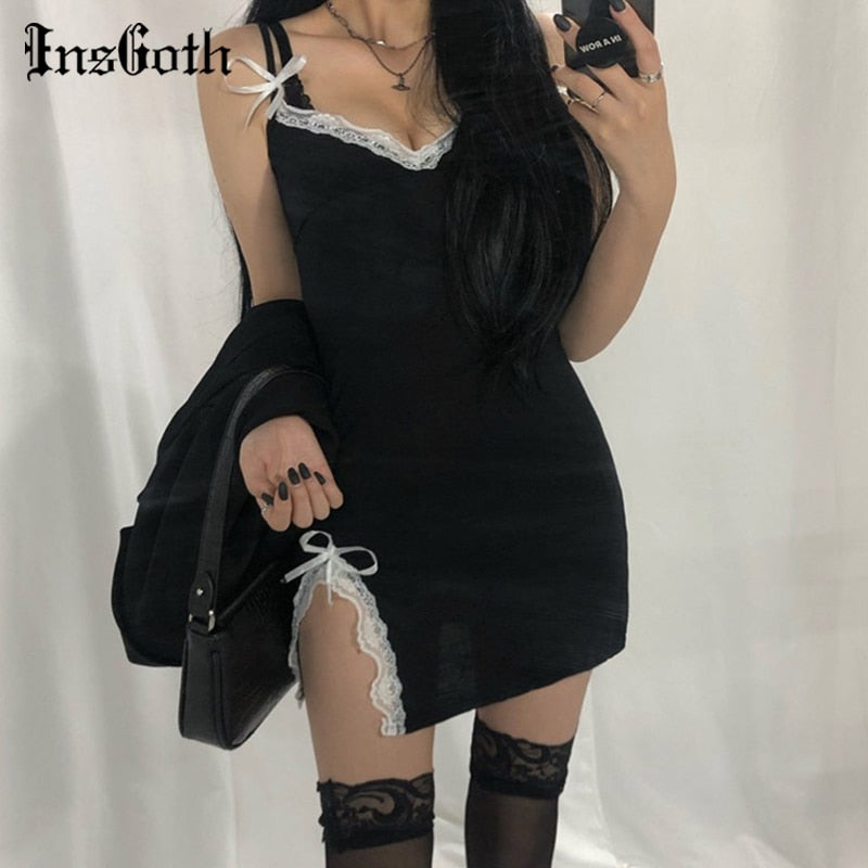 InsGoth Sexy Lace Patchwork Black Mini Dress Women Gothic Streetwear Spaghetti Straps V-neck Slit Dress Party Clubwear Dress