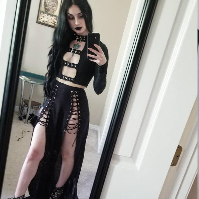 InsGoth Sexy Women Crop Tops Hollow Out Buckle Long Sleeve Female Bodycon Tops Gothic Punk Black Tops Streetwear Party Lady Tee