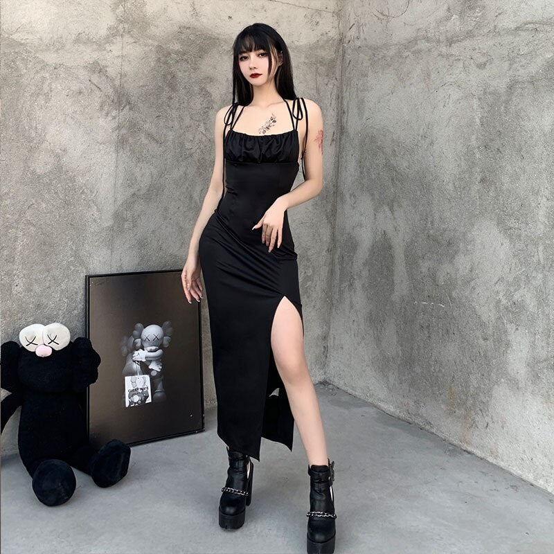 InsGoth Spaghetti Strap Sexy Black Dress Goth Bodycon High Waist Slit Dress Women High Street Backless Party Club Wear Dresses