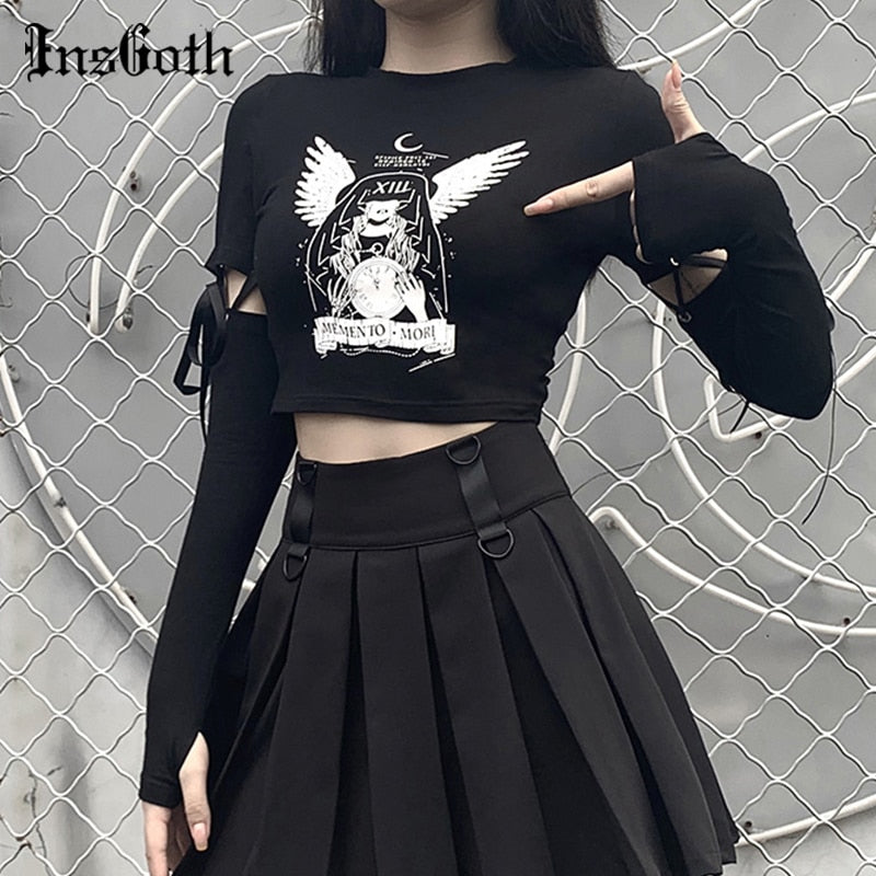 InsGoth Witch Print Black Bodycon Tops Women Gothic Harajuku Punk Patchwork Long Sleeve Slim T-shirts Fashion Autumn Female Top