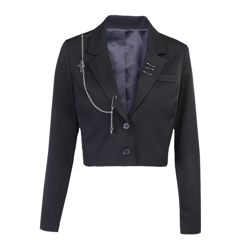 InsGoth Women Punk Gothic Black Blazer Harajuku Streetwear Metal Chain Patchwork Suit Office Ladies Commute Short Coat