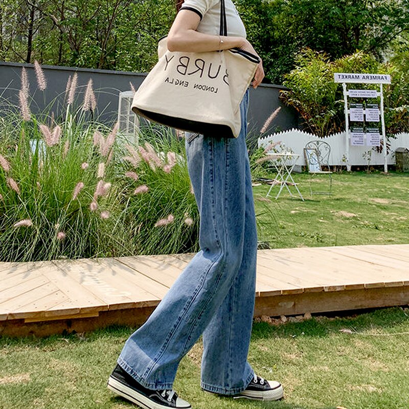 Jeans Women High Waist Wide Leg Vintage Korean Harajuku Style All-match Denim Clothing Chic Leisure Pockets Zipper Simple Solid