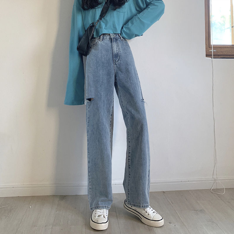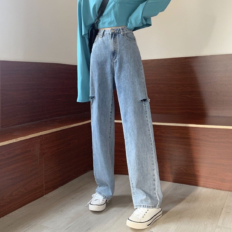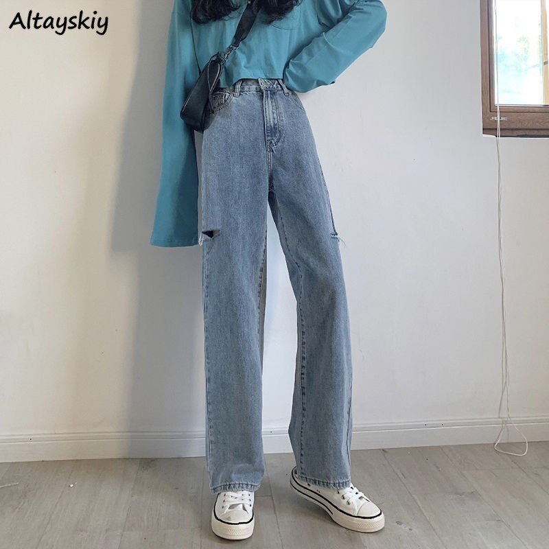 Jeans Women Hole Preppy Style Trendy Spring Female Student Loose Straight High Waist Kpop Vintage Solid Streetwear Mujer De Moda