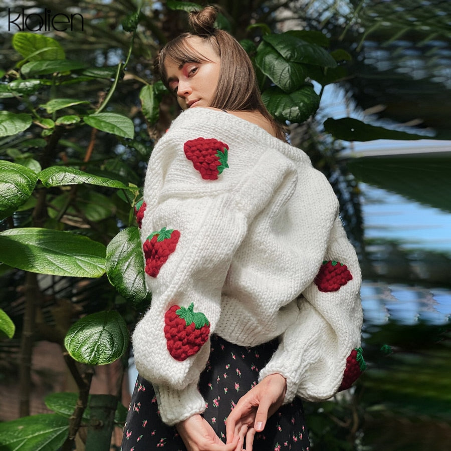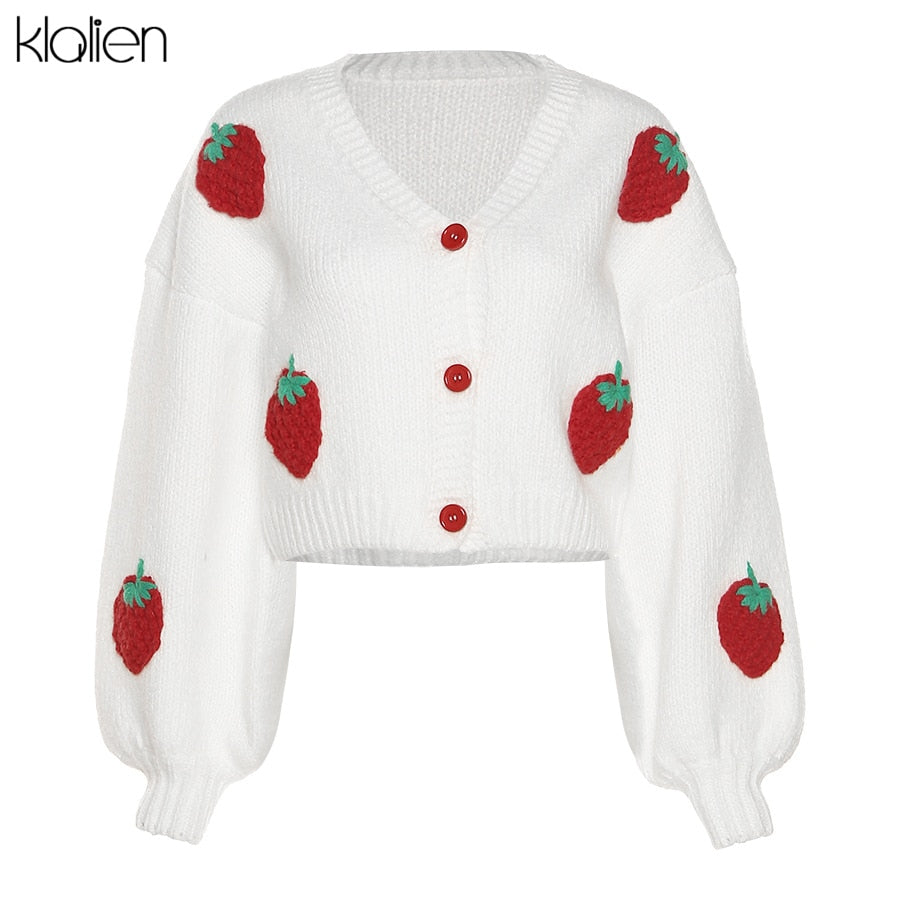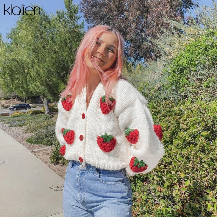 KLALIEN Fashion Elegant Cute Print Strawberry Single Breasted Sweater Women Autumn Thicken Warm Cardigan Sweater Streetwear