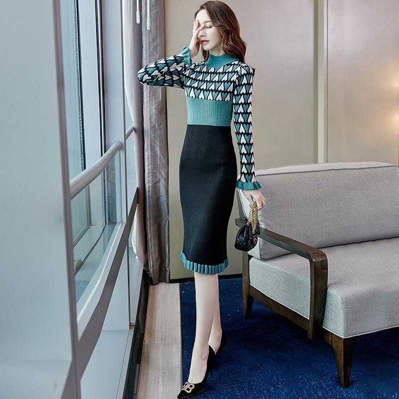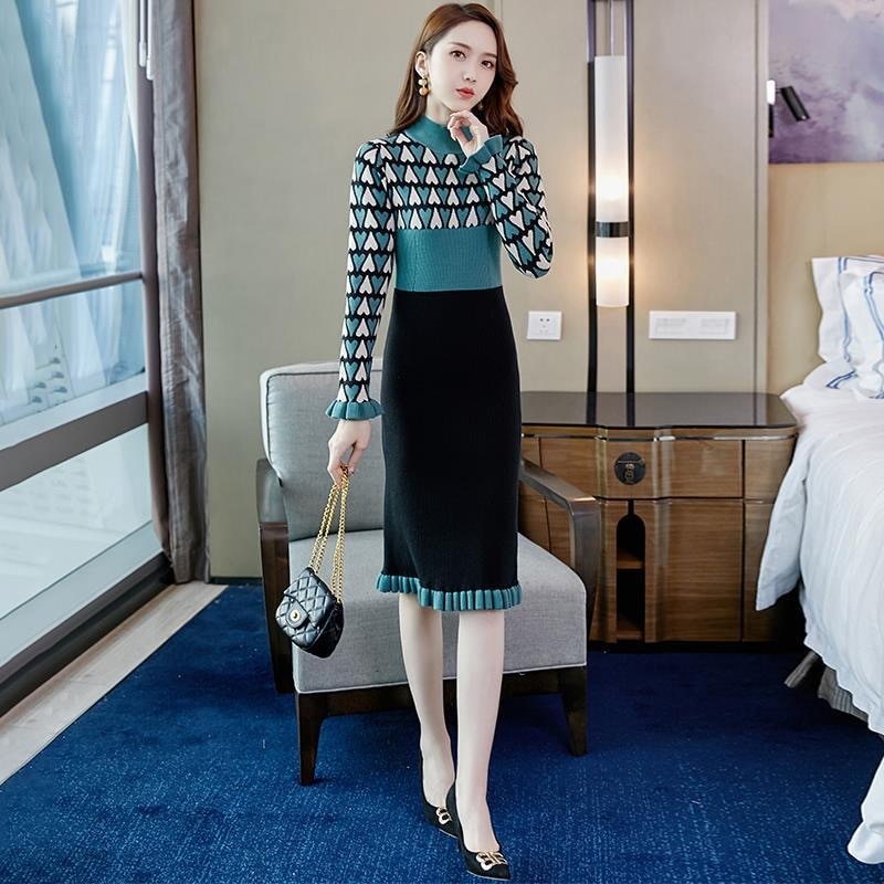 Knit Love Print Sweater Dress Autumn Winter For Women Lady Vintage Slim Dress Female Half Turtleneck Patchwork Bodycon Dress