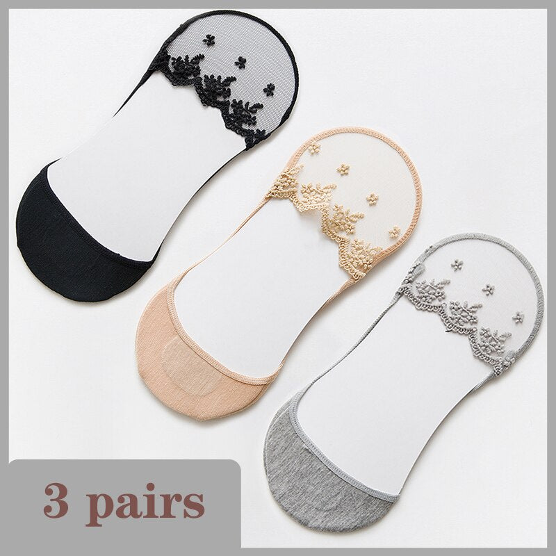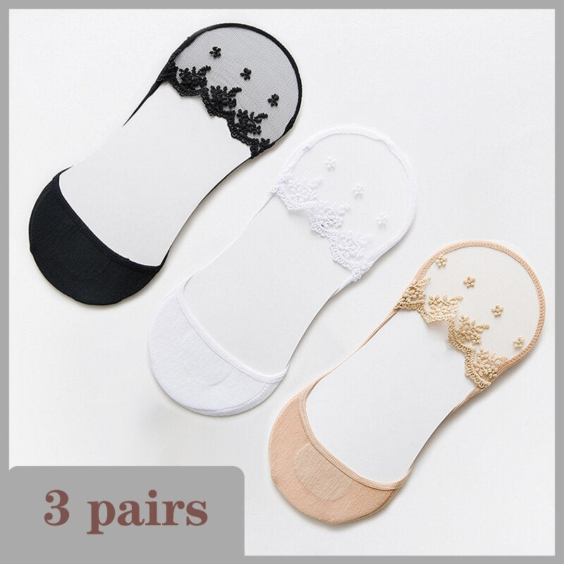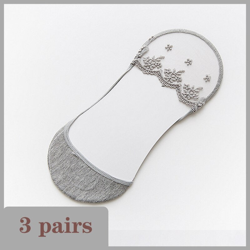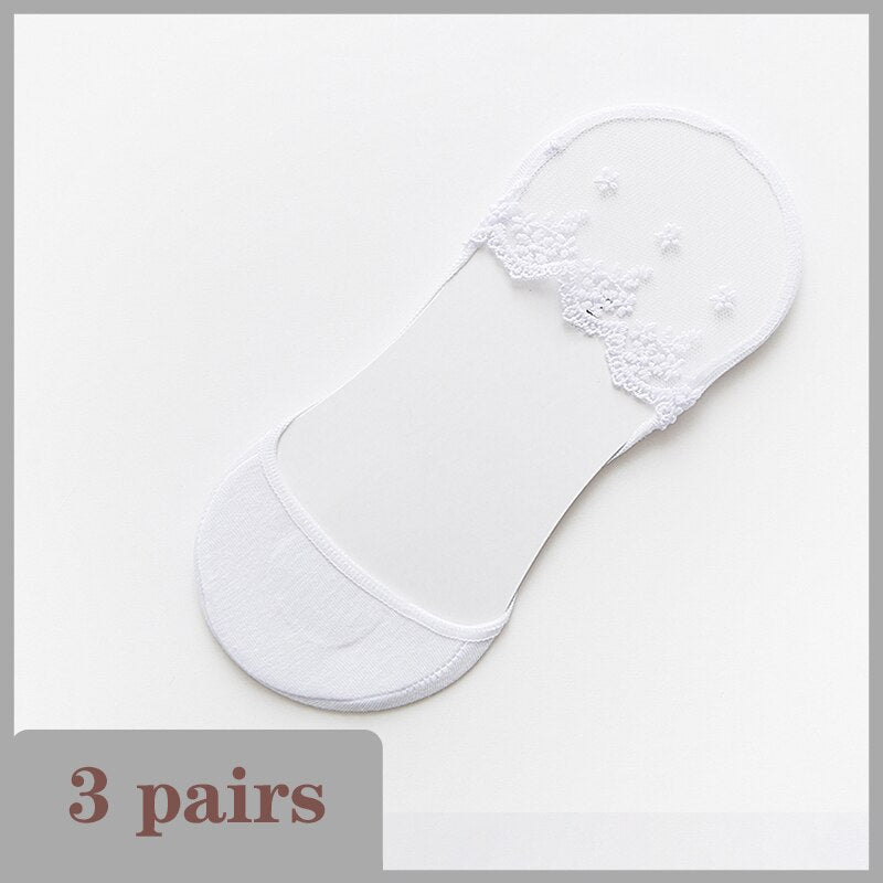 Lace Socks Women Summer Breathable High Heel Invisible Boat Socks Ankle Low Cut Sock Solid Embroidered Female Sox 3 Pairs