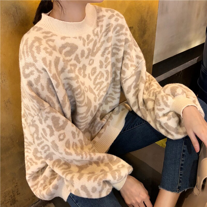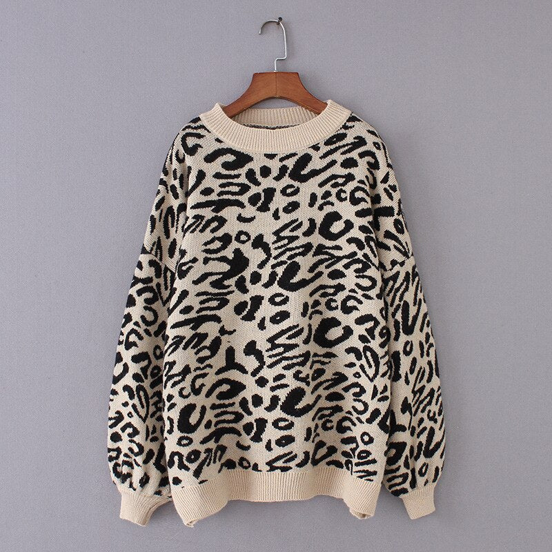 Leopard Knitted Sweater Women Animal Print Winter Sweater Female o-neck Thick Pullover Loose Casual Tops Girls Oversized Sweater