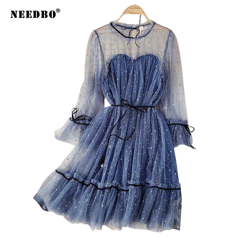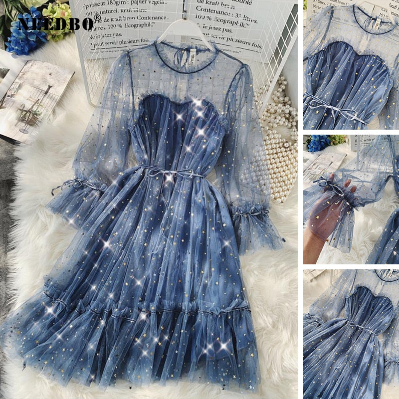 NEEDBO Sexy Dress Vestidos Star Sequined Mesh Shiny Fairy Dress Women Elegant Bling Gauze Princess Loose A-line Puff Dresses Rob