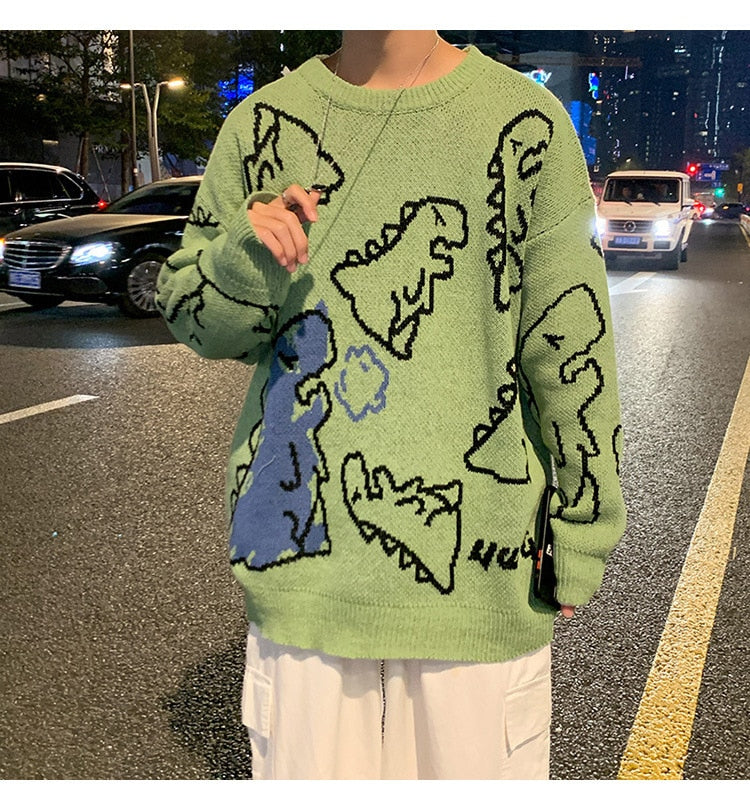 Oversize Green Sweater Women Fashion Y2K Dinosaur Printed Top Harajuku 90s Knit Sweater Loose Casual Pullover Winter Jumper