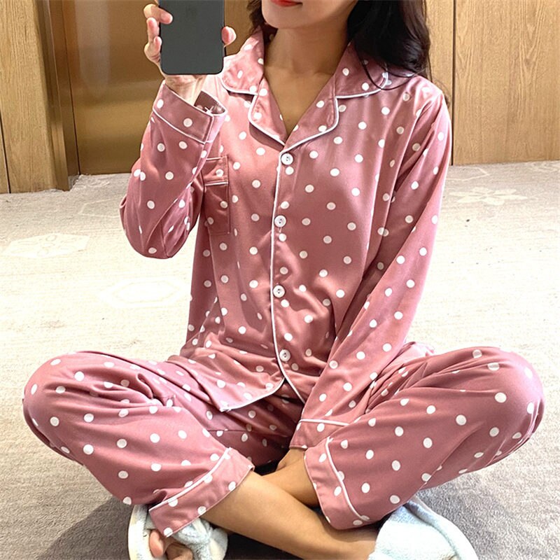 Pajamas Set Women Homewear Dot Pattren Long Sleeves Pink Blue Pijamas Sets Soft Pyjamas Female Lingerie Sleepwear Suit for Girls