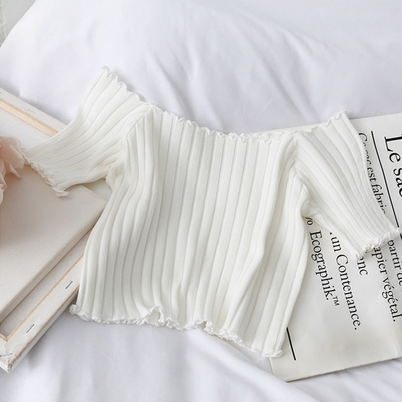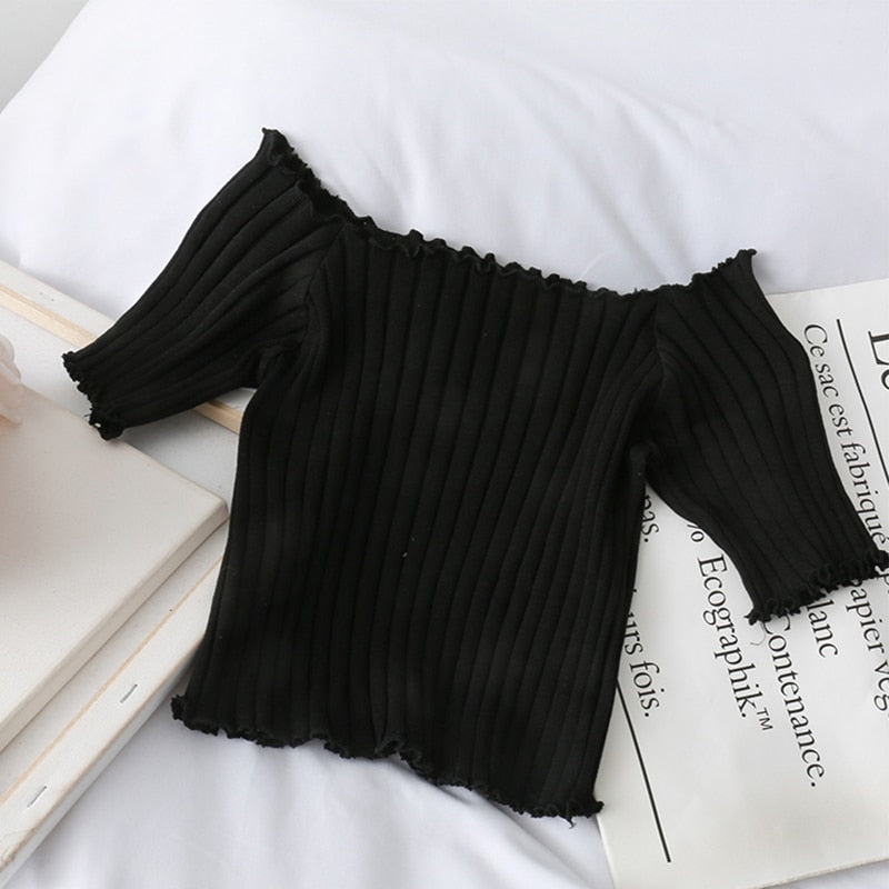Ribber Purple T-shirt Off Shoulder Knitting Crop Top Women Short Sleeve Stretchy Ruffles Female Tshirt Y2k Stripes Summer Tops