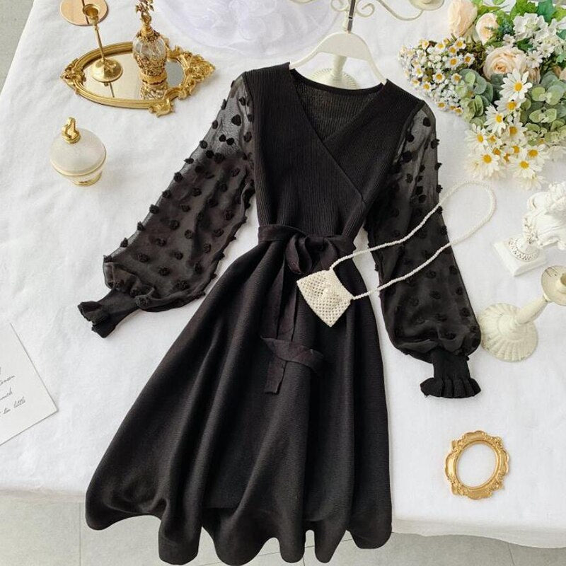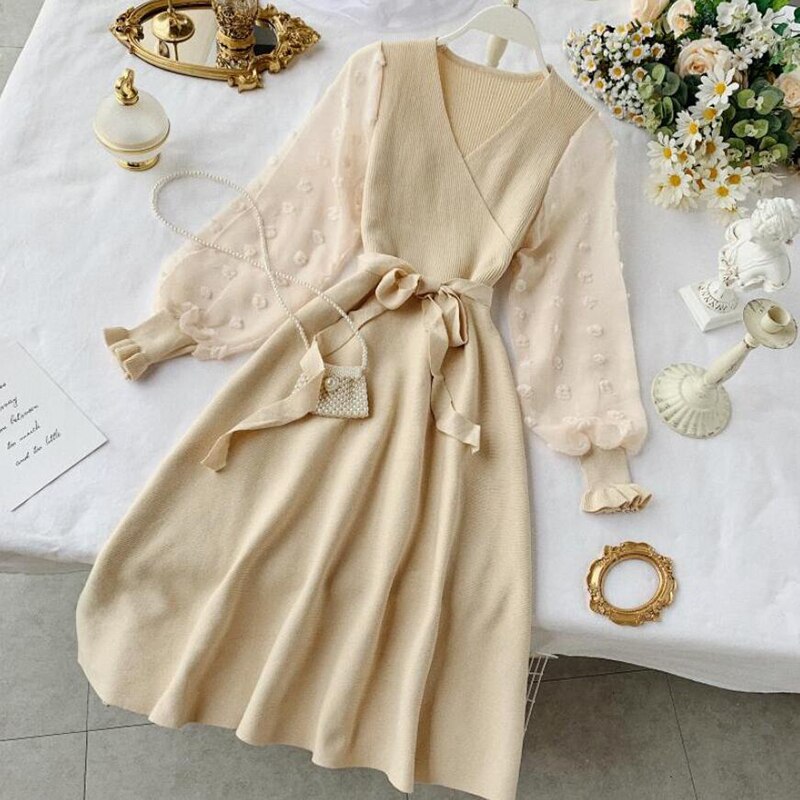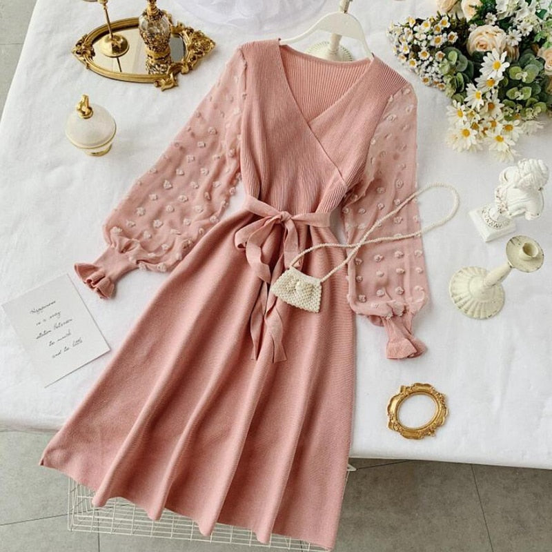 Romantic Women Knitted Pink Party Dress 2020 Fall Winter V Neck Elegant Chiffon Long Sleeve Sashes Dress Ladies Dress