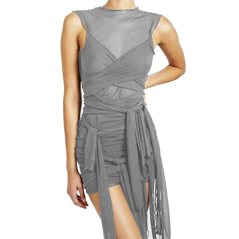 See Through Bodycon Party Dresses Mesh Sexy Clubwear Mini Dress Sleeveless Basic Female Streetwear Bandage One-Piece Femme Robe