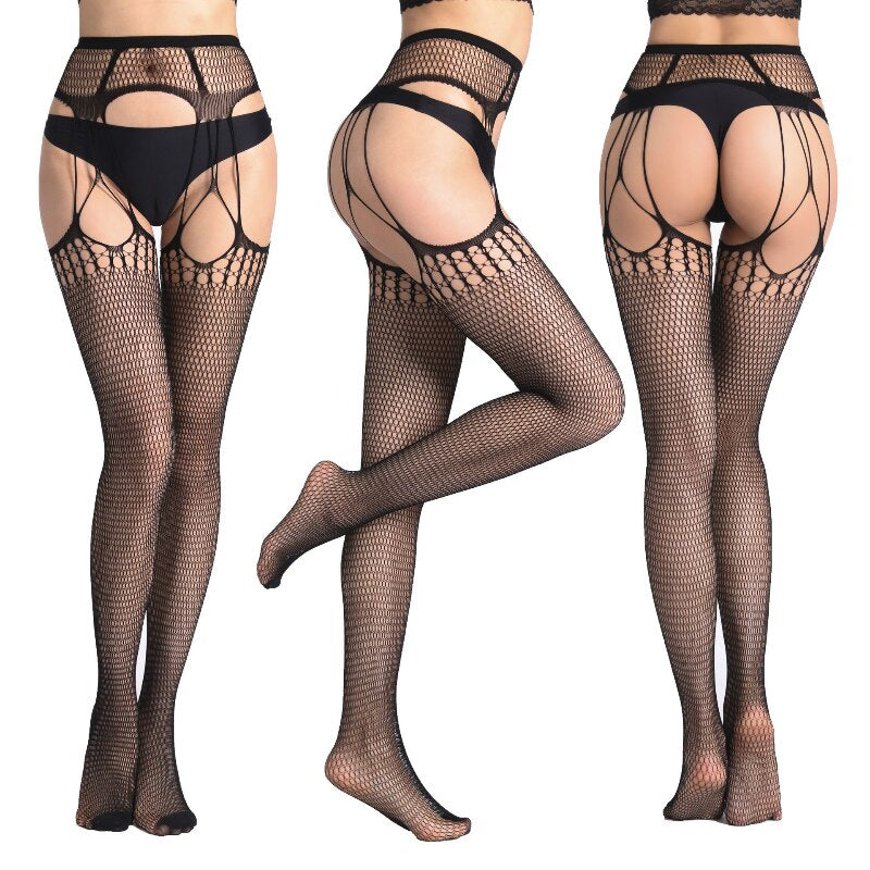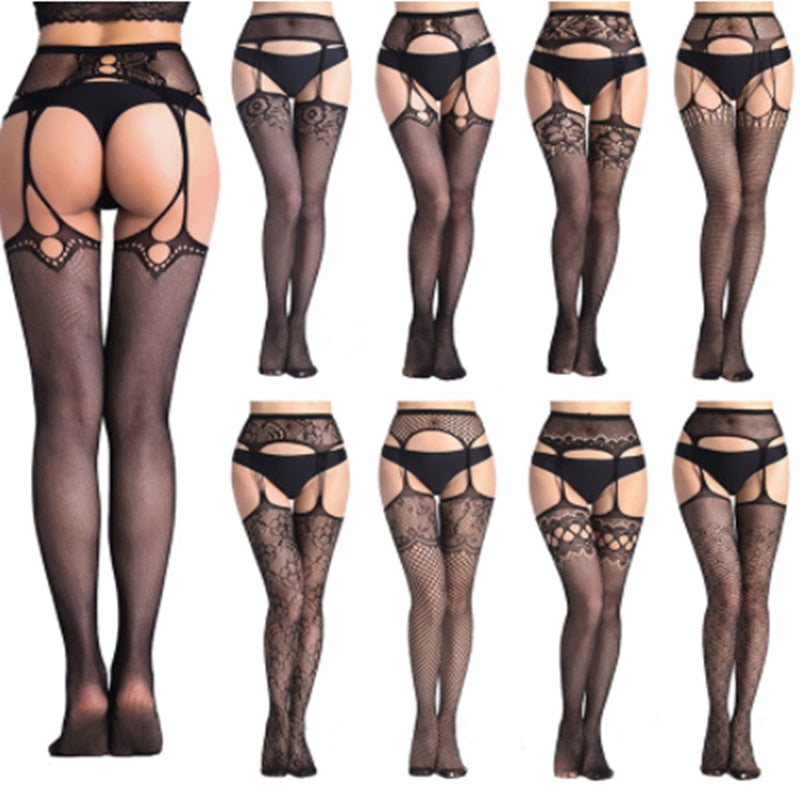 Sexy Pantyhose Fishnet Lace Open C Thigh High Stockings + Garter Belt Suspenders Underwear Women Black Floral Pantyhose