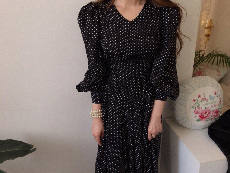 Spring Fashion French Vintage Maxi 2021 Ladies Lantern Sleeve Dot Chiffon Dresses Femme Autumn Robe
