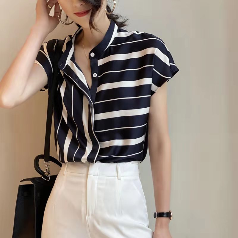 Summer Women Casual Striped Shirt Short Sleeve Office Lady Commuting Chiffon Shirt
