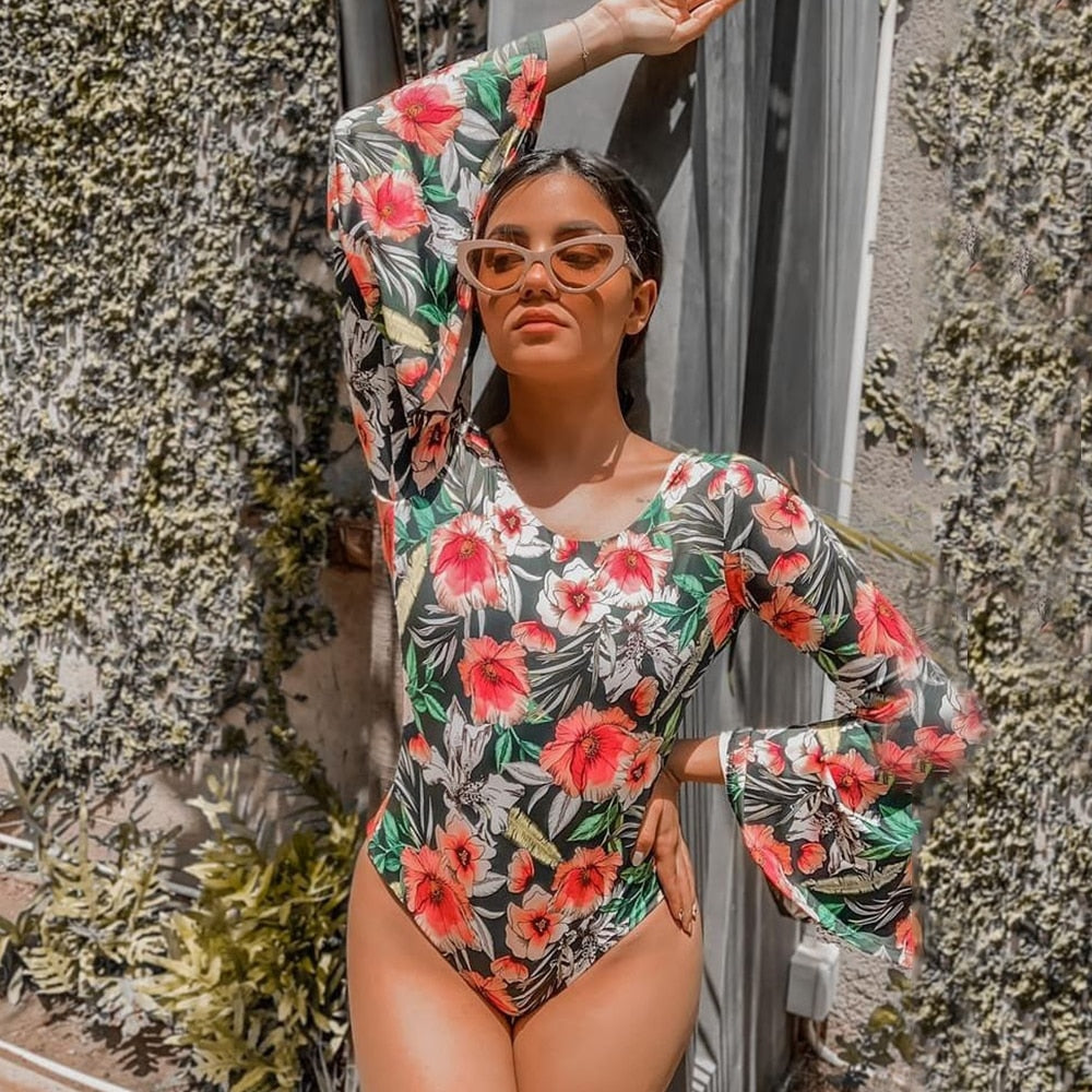 Swimwear Women Print 2021 New One Piece Swimsuit Flared Sleeves Bathing Suit Retro Ruffle Strappy Vintage Beachwear Surfing
