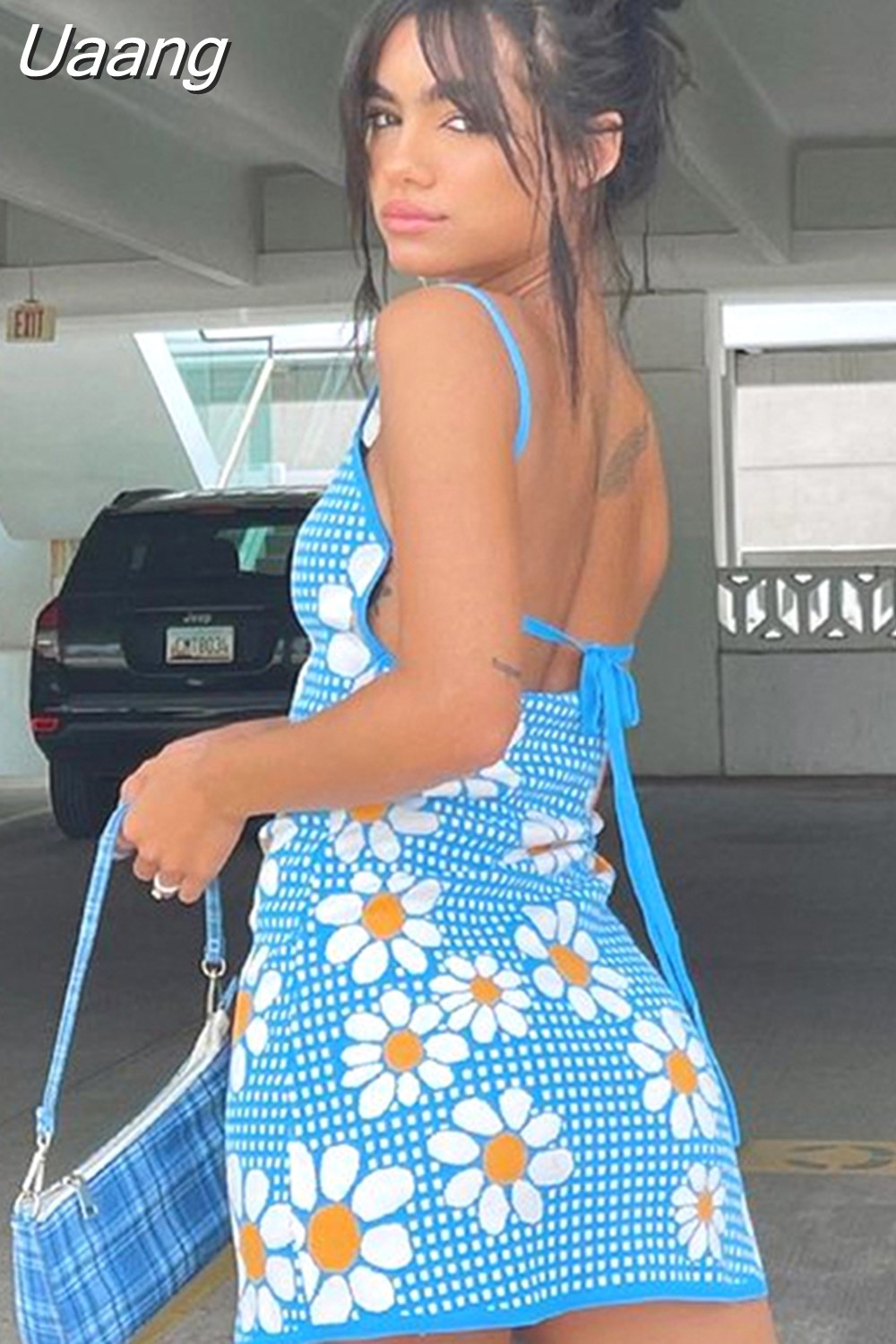 Uaang Aesthetic Floral Print Knitted Mini Dress Sexy Backless Lace Up Spaghetti Strap Cami Sundress Chic Women Beach Clothes