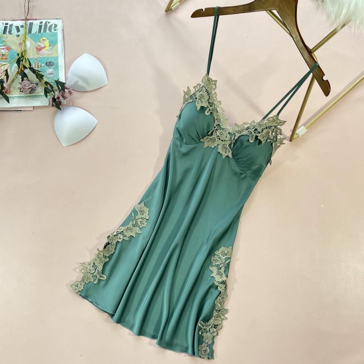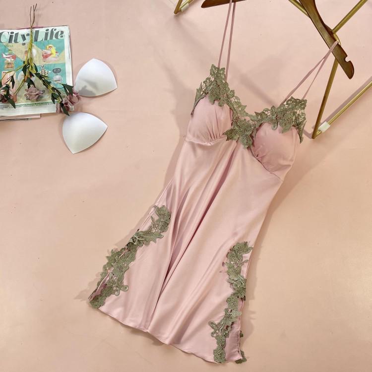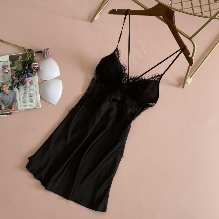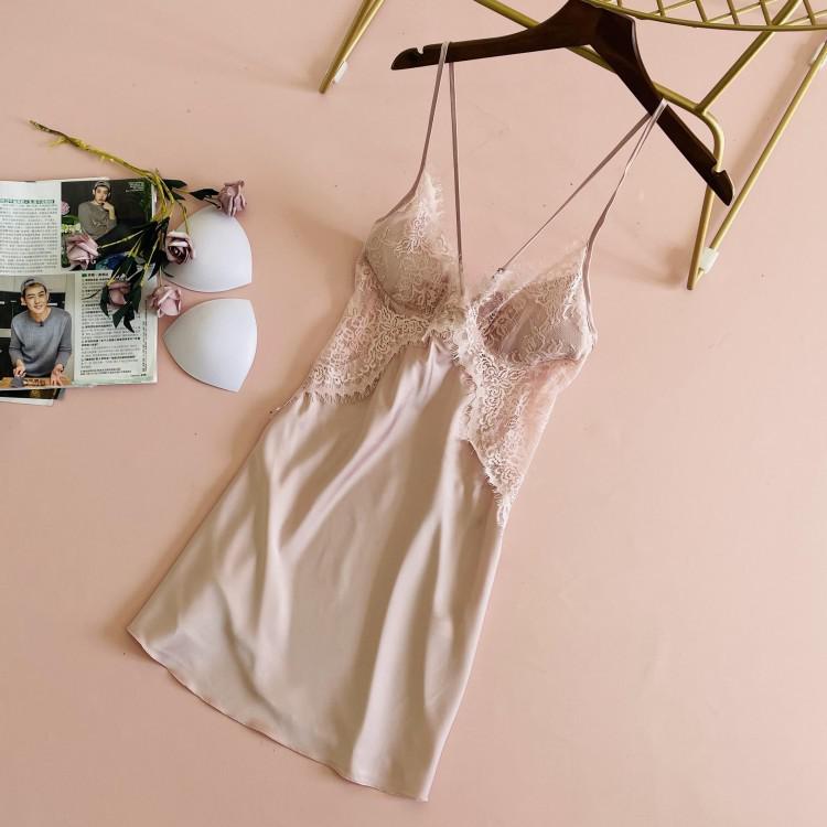 Uaang Lace Satin Nightdress Lady Strap Backless Nighty Gown Summer Sleeveless With Chest Pads Nightgown Sleepshirt Lounge Sleep Dress