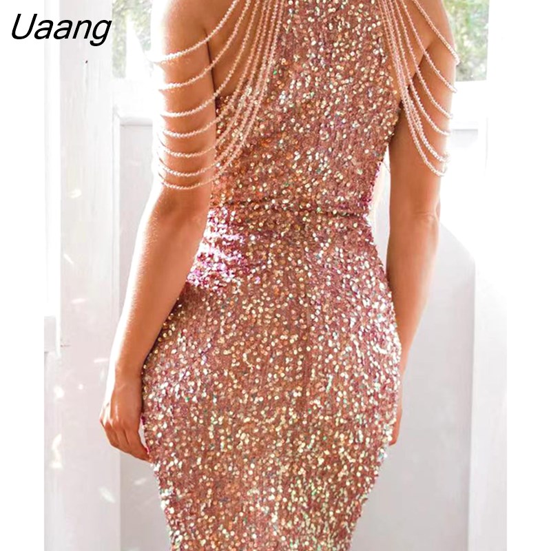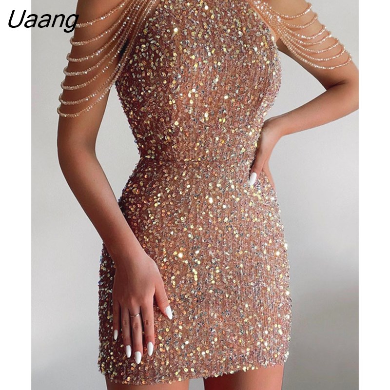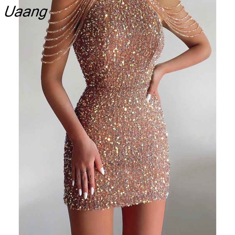 Uaang Women Sexy Slim Fit Sequined Beaded Decor A-Line Dress