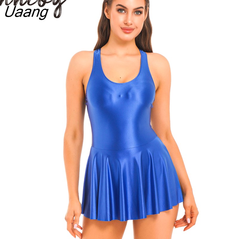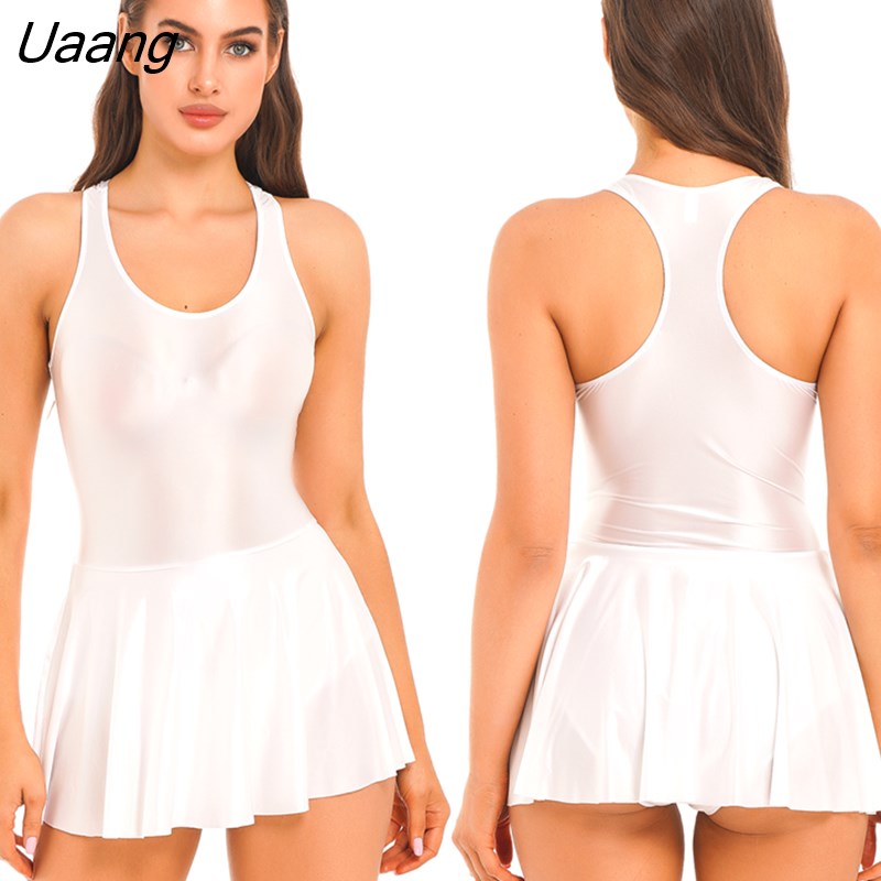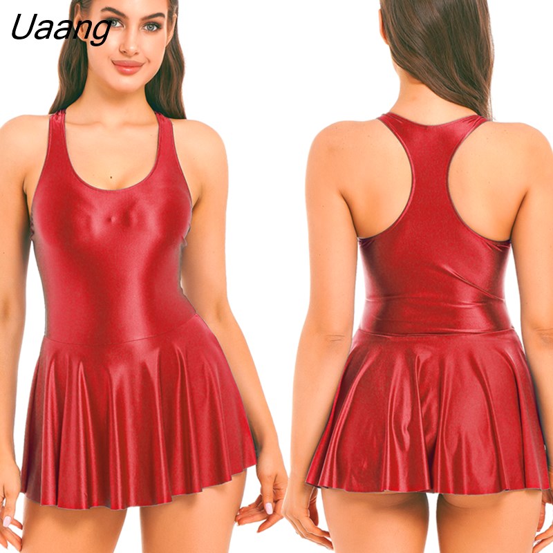 Uaang Womens Glossy Skirted Leotards Dance Dress Sexy Oil Shiny Tight Sports Yoga Ballet Practice Training Clothing Gymnastics Tutu