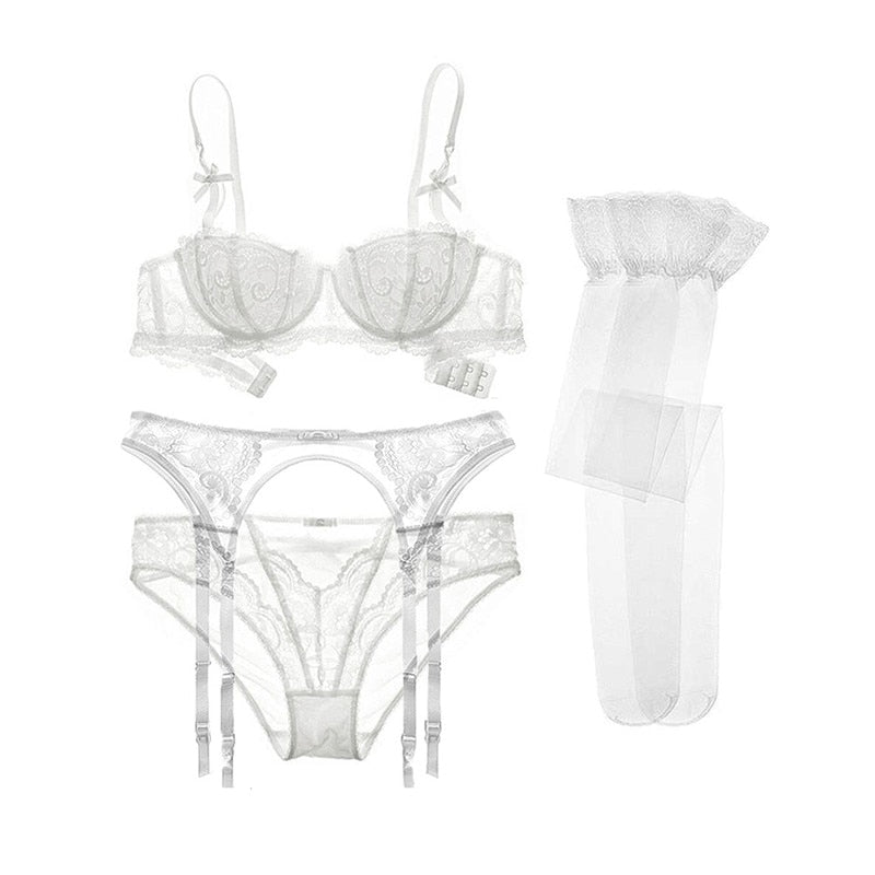Varsbaby Sexy Bow Underwire Half Cup Push Up Bra Set 4Pcs Bra+Panties+Garter+Stockings For Ladies