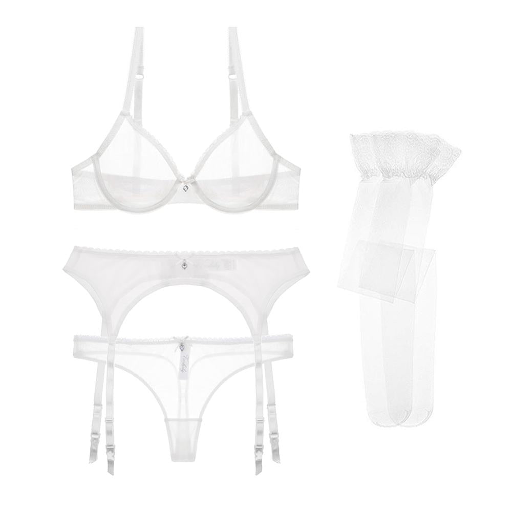 Varsbaby sexy ultra-thin transparent yarn lingerie set bras+garters+thongs+stockings 4 pcs for young women