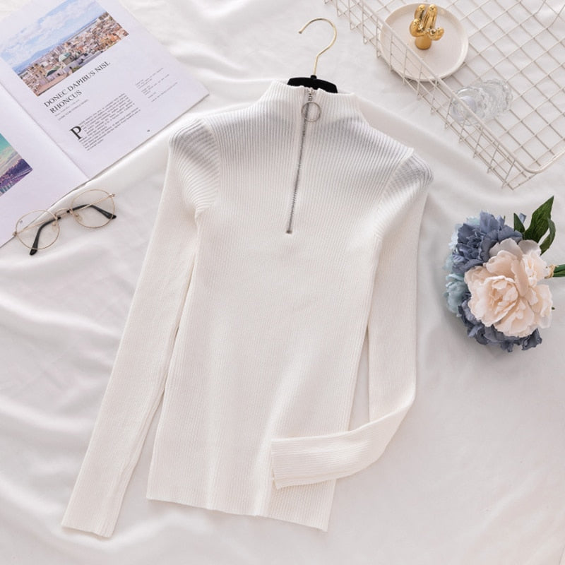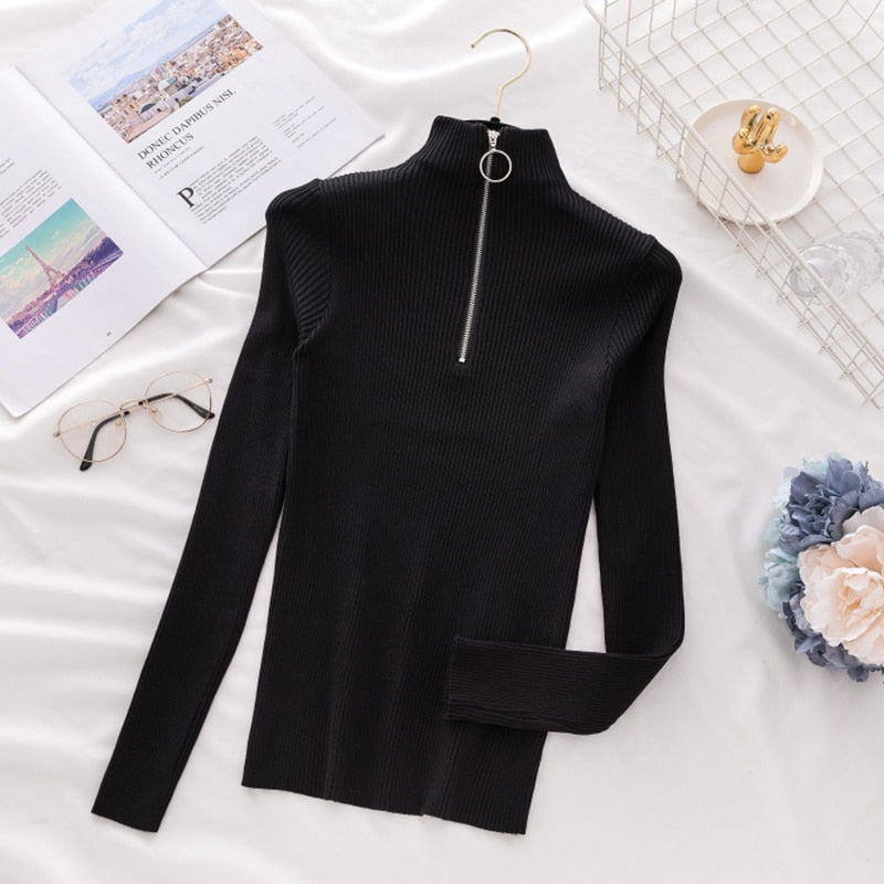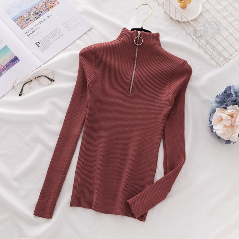 Women Office Lady Front Zipper Slim Knitted Sweater Long Sleeve Stand Collar Solid Casual Pullover 2021 Autumn Winter New Tops