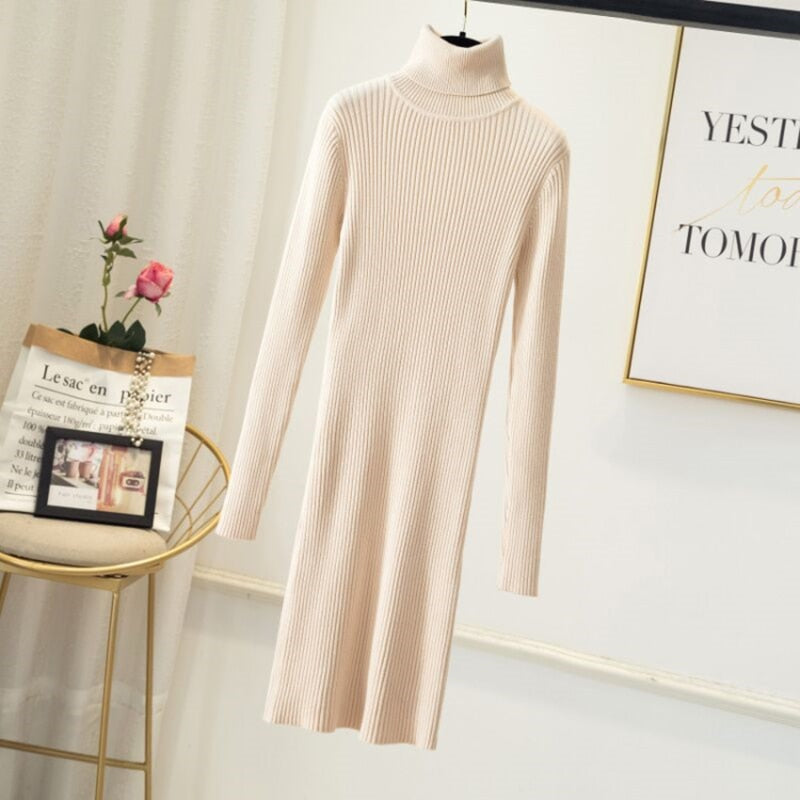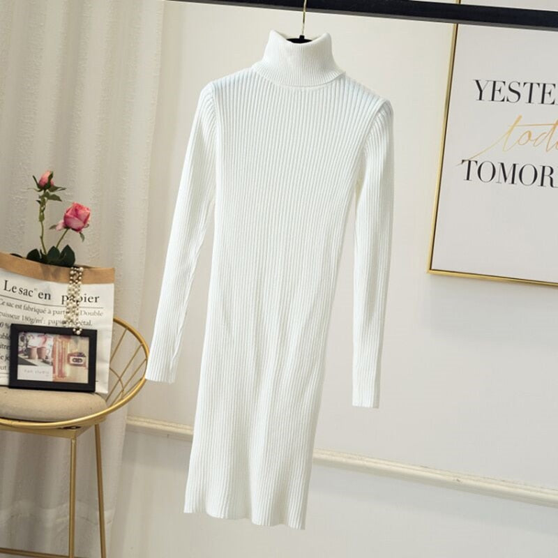 Women Office Lady Slim Pit Knitted Sweater Dress Long Sleeve Turtleneck Solid High Street Casual Dress 2021 Winter Fashion Dress