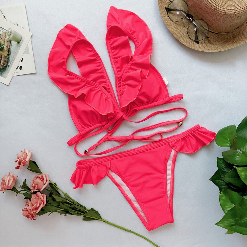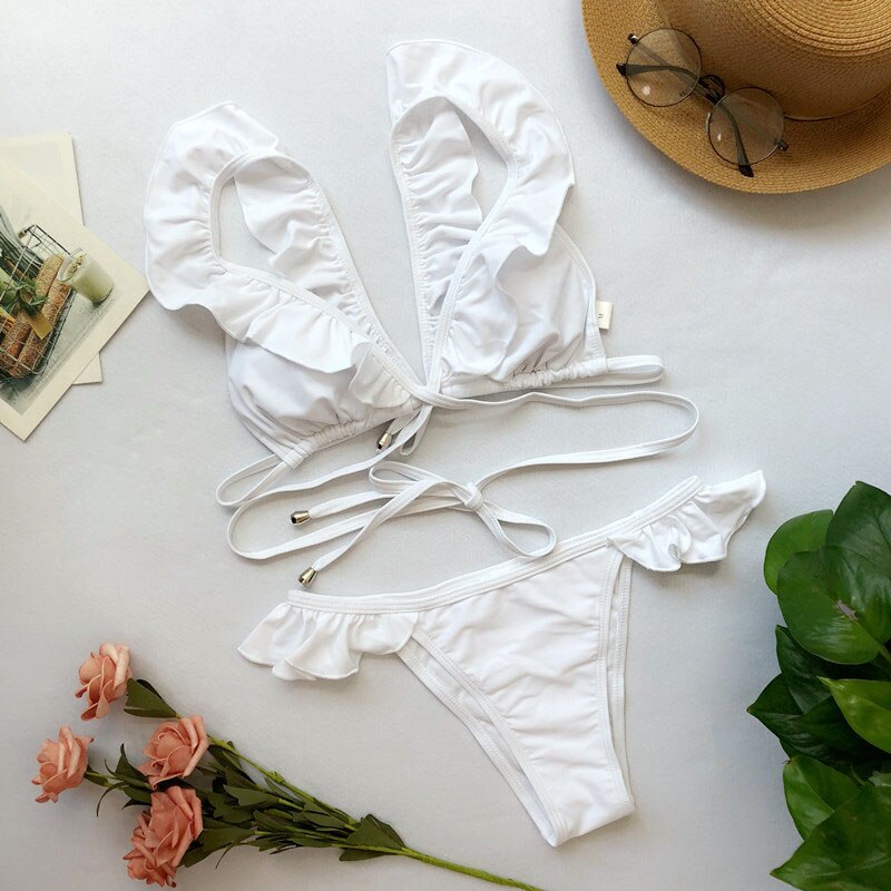 Women Swimsuit 2019 Sexy Solid Push Up Bikinis Ruffle Shoulder Bikini Set Pad Vest Bikini Low Waist Bandage Swimwear 3563