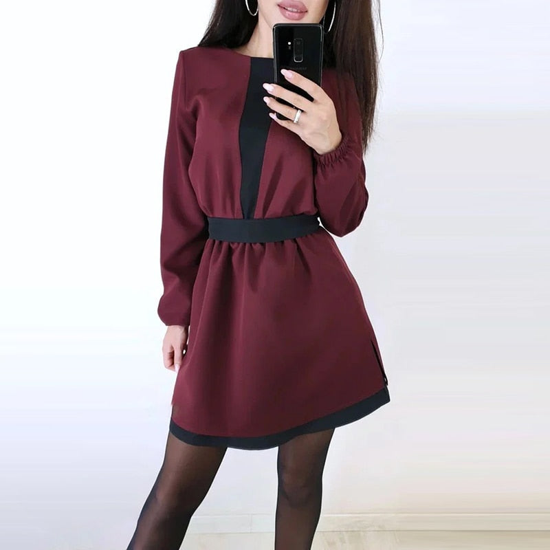 Women Vintage Color contrast A-line Mini Dress Long Sleeve O neck Solid Elegant Casual Party Dress 2021 Autumn New Fashion Dress
