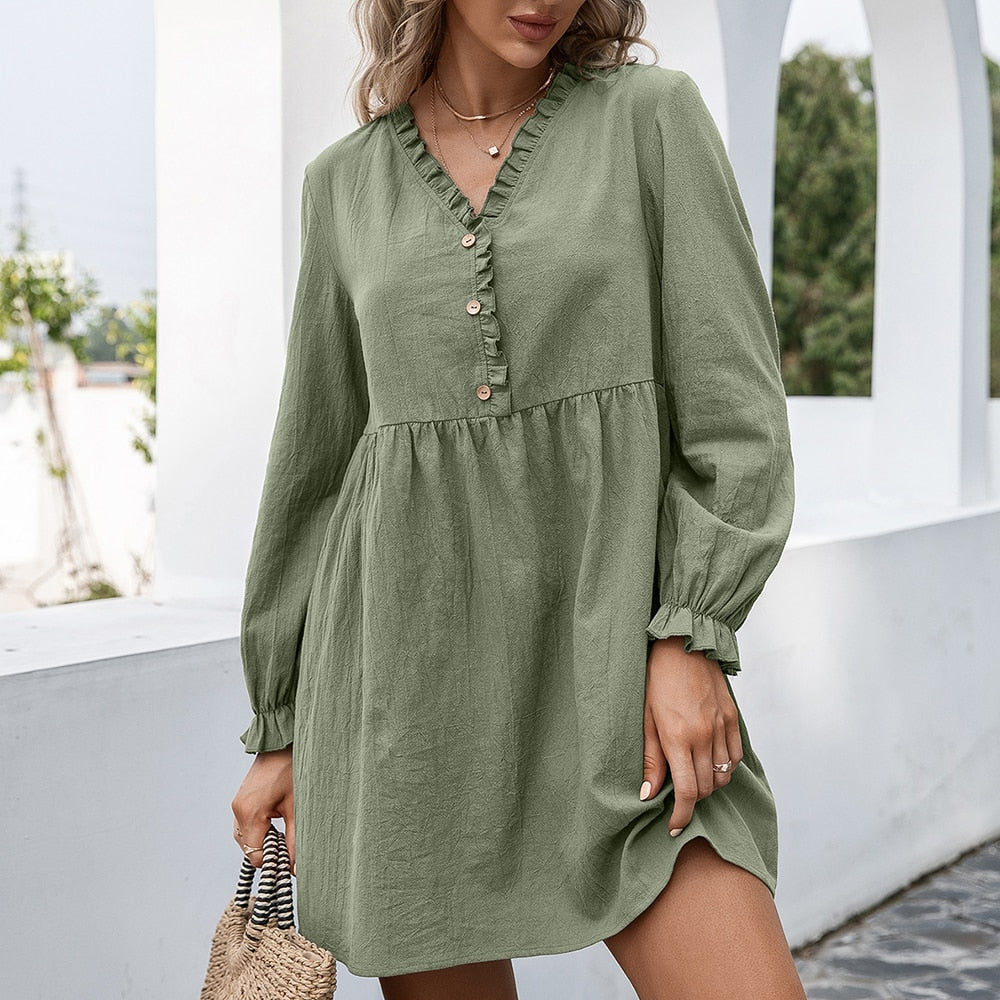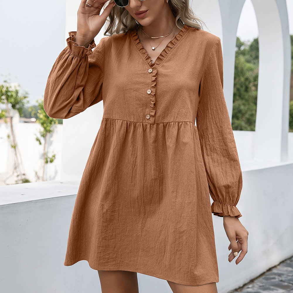 Women Vintage Front Button Ruffled A-line Dress Lantern Sleeve Deep V neck Solid High Street Mini Dress 2021 Autumn New Dress