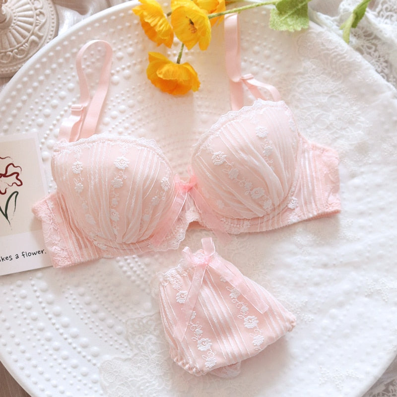 Wriufred Girls underwear fresh and sweet embroidered flowers lace gathered lingerie set with steel ring big cup bra set