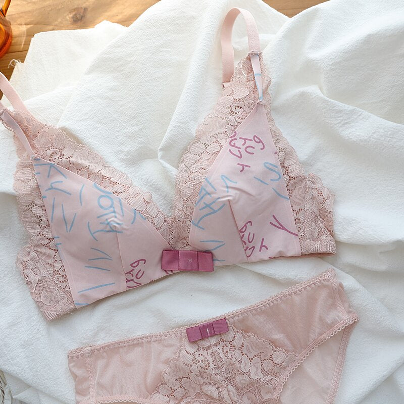 Wriufred Random letters graffiti lingerie with panties set thin underwear women's non-wireless comfortable bra set bow cute bras