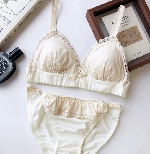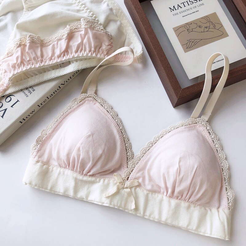 Wriufred Retro Cotton Wire Free Bra Sets Sexy Lace Lingerie Set Triangle Cup Women Bra Underpants Suit Girl Cute Bow Underwear