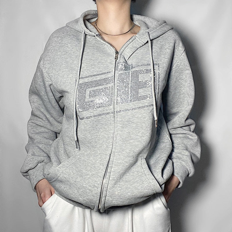 Y2K Rhinestone Skeleton Zip Up Hoodies Women Oversized Sweatshirts Winter Grunge Gothic Black Hooded Female Jackets Streetwear