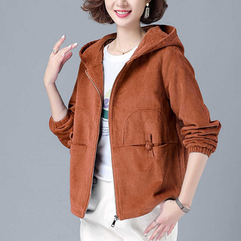 Zoki Autumn Women Corduroy Jacket Fashion Hooded Zipper Loose Female Coat Causal Plus Size Korean Long Sleeve Ladies Outwear