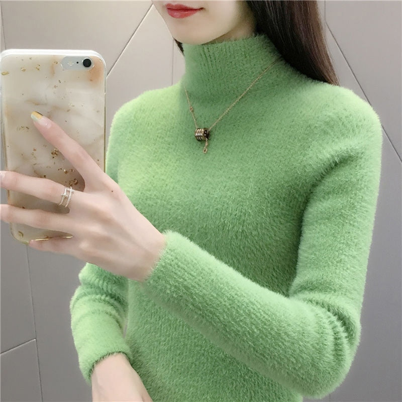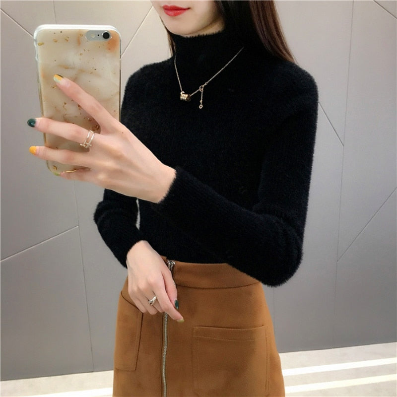 Zoki High Quality Faux Fur Women Knitted Sweater Winter Warm Turtleneck Pullover Female Top Casual Thick Korean Loose Jumper
