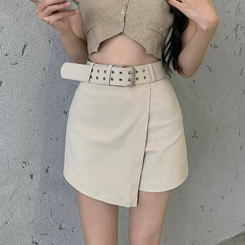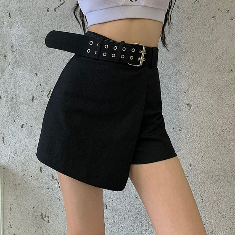 Zoki High Waist Summer Women Shorts Fashion Belt Irregular Korean Black Cotton Casual Office Ladies Designed Shorts New 2021