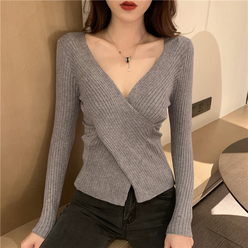 Zoki Knitted Full Women Sweater Long Sleeve Fashion Crossed V Neck Jumper Causal Sexy Autumn Slim Pullover Ladies Basic Top 2021