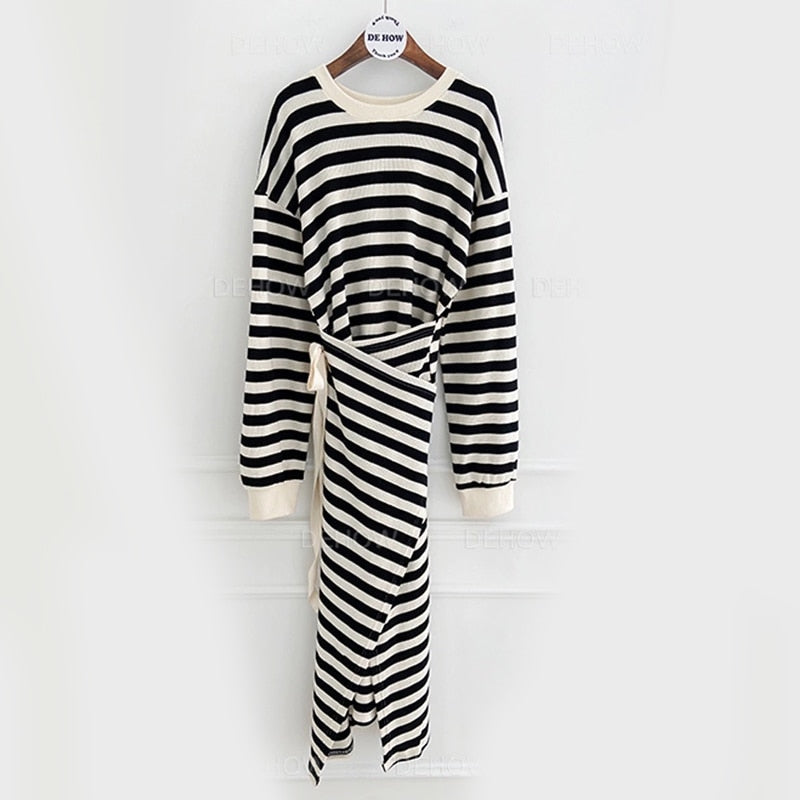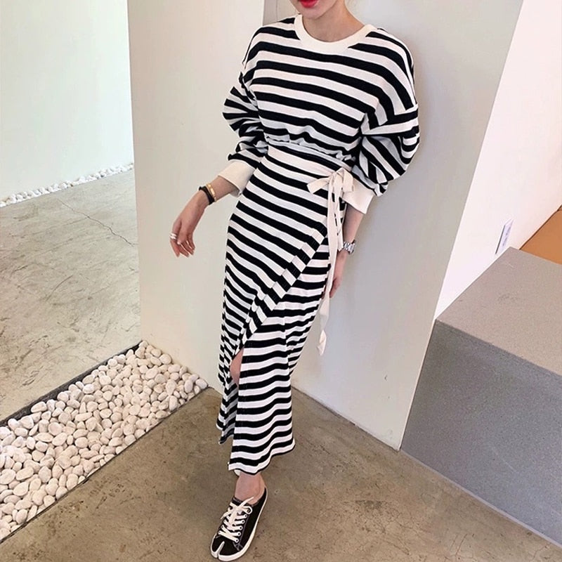 Zoki Korean Tunic Women Maxi Dress Spring High Waist Lace Up Fashion Long Sleeve Striped Streetwear O Neck Female Party Vestidos