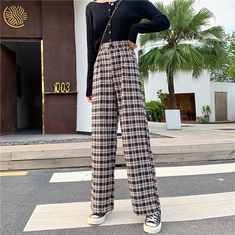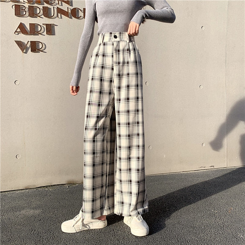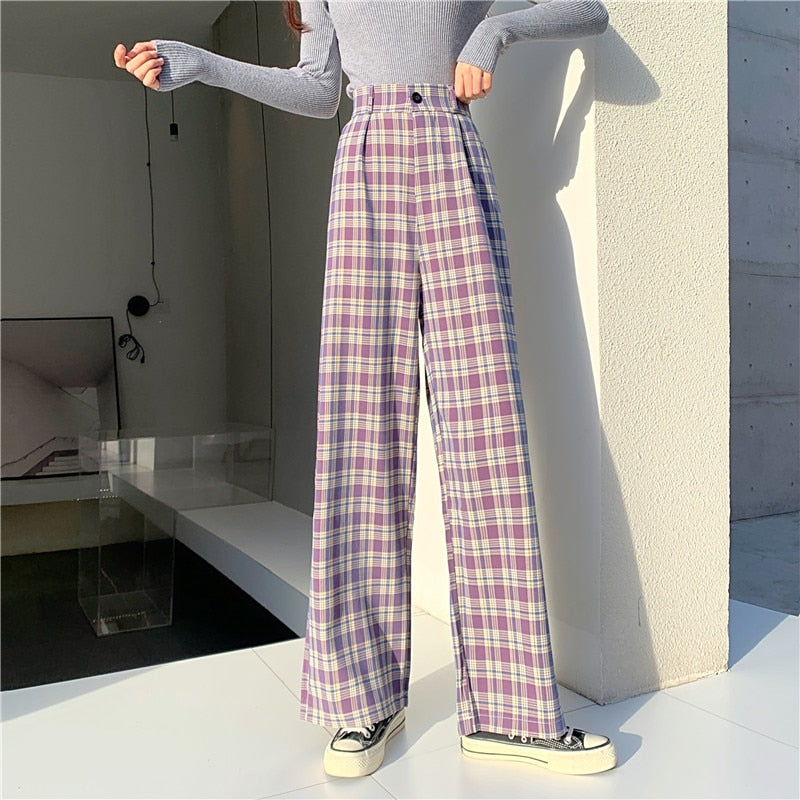 Zoki Plaid Women Pants Elastic High Waist Korean Fashion Plus Size Loose Spring Ladies Full Straight Pants Casual Trousers S-4XL