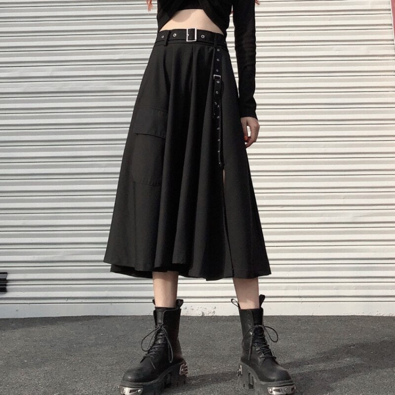 Zoki Punk Women Midi Skirt Summer Black Fashion Split High Waist Belt A Line Dark Academic Gothic Long Skirt Streetwear Faldas