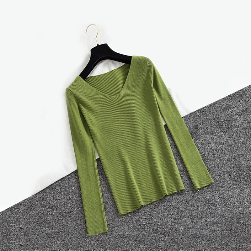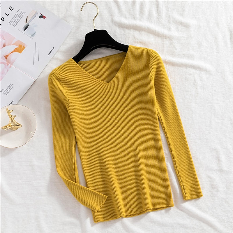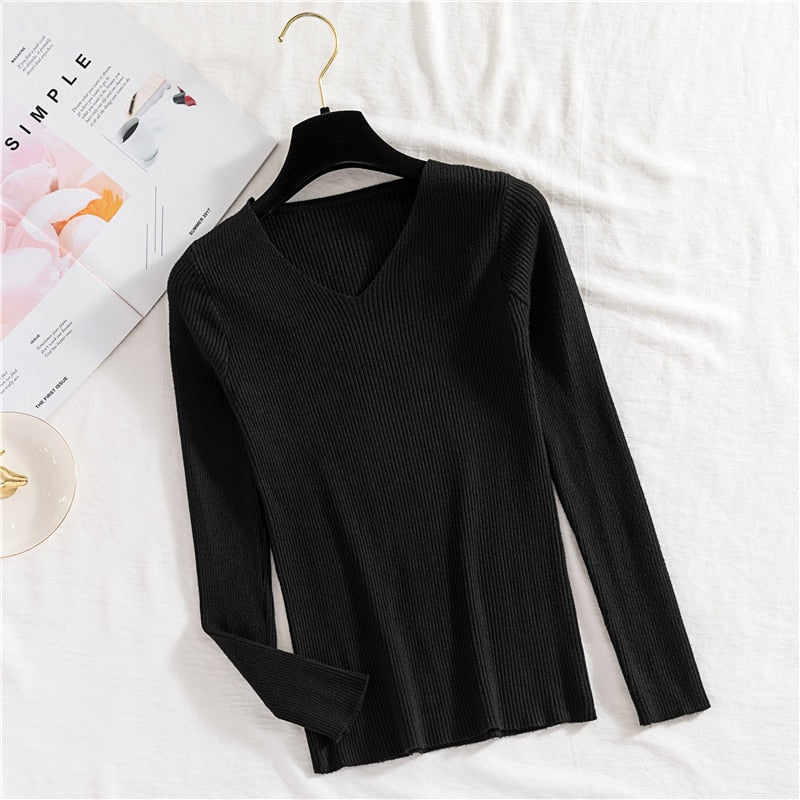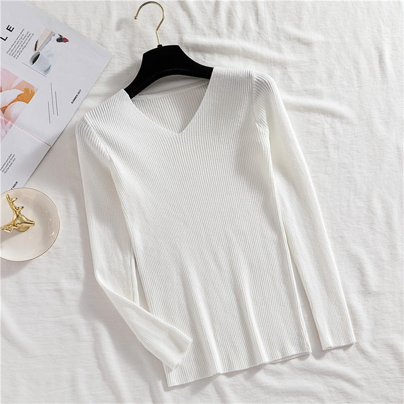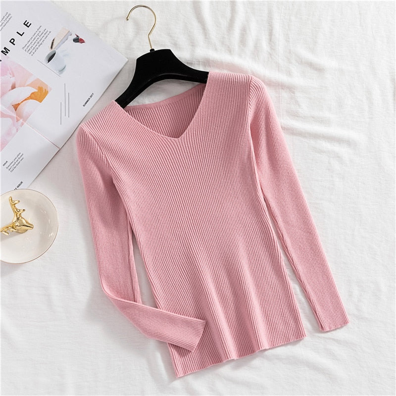 Zoki Sexy V Neck Women Pullover Sweater Fashion Autumn Winter Long Sleeve Knitted Jumper Top Casual Korean Slim Basic Blouse