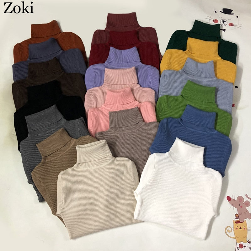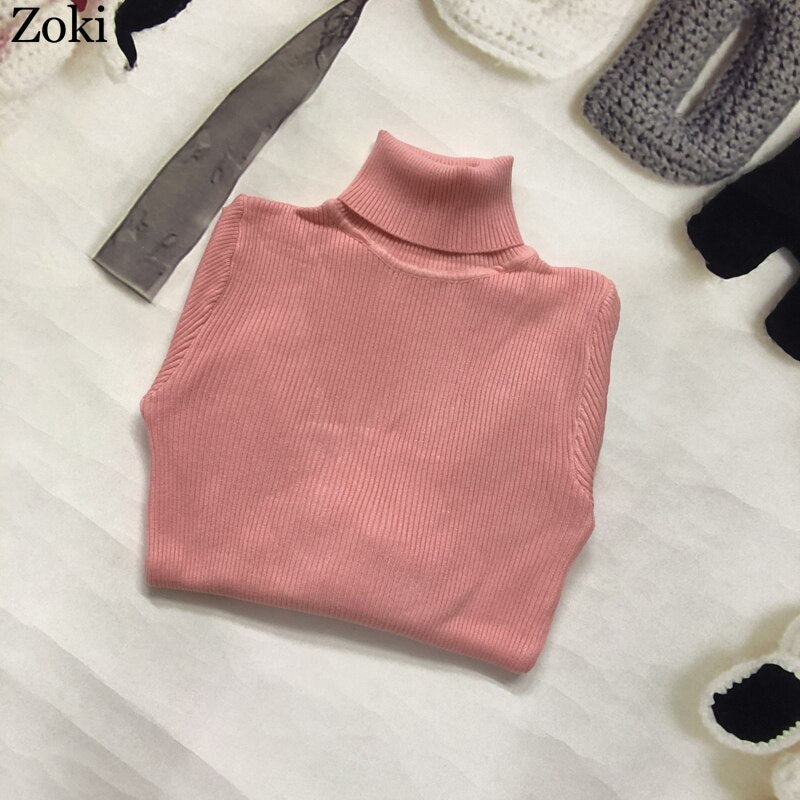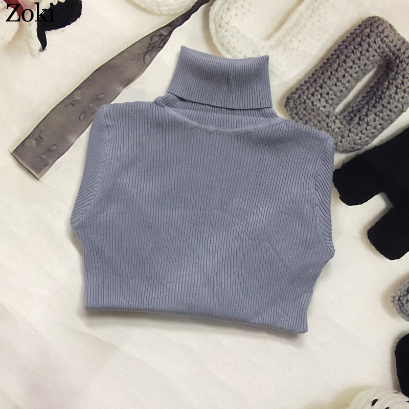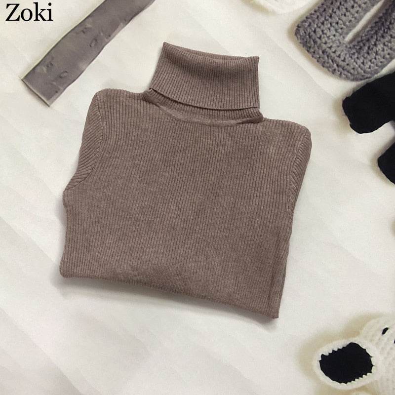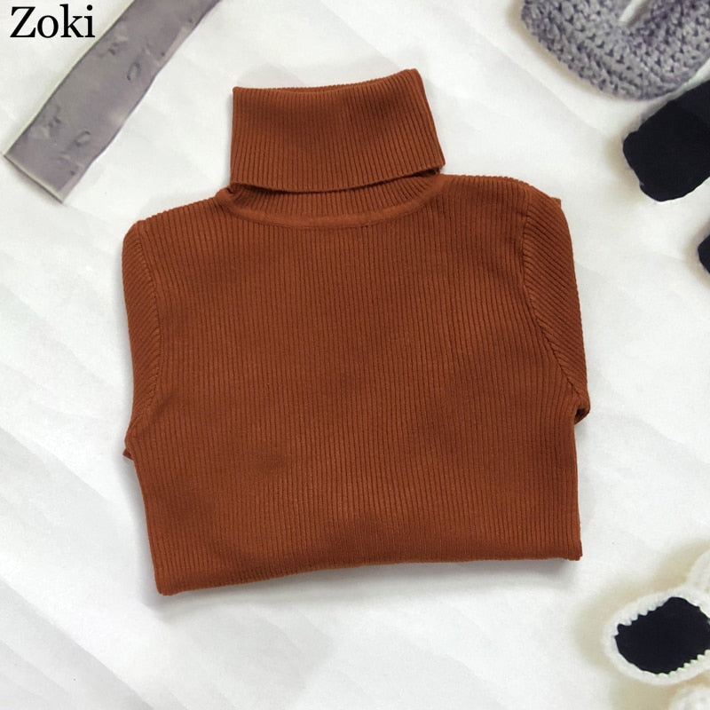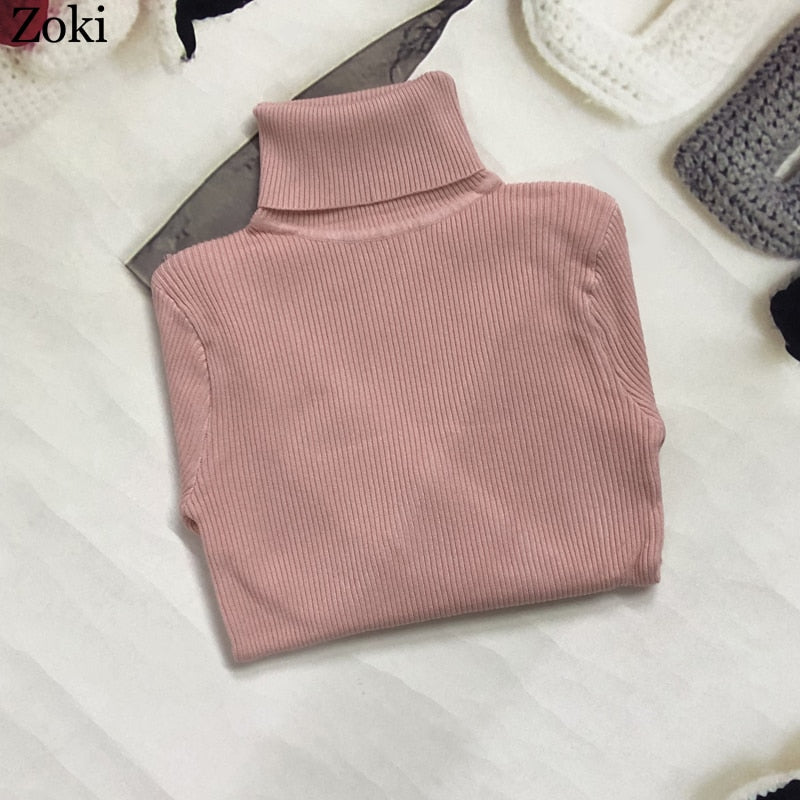 Zoki Soft Women Turtleneck Sweater Autumn Long Sleeve Elastic Female Knitted Jumper Casual Pullover Slim Winter Basic Tops 2021