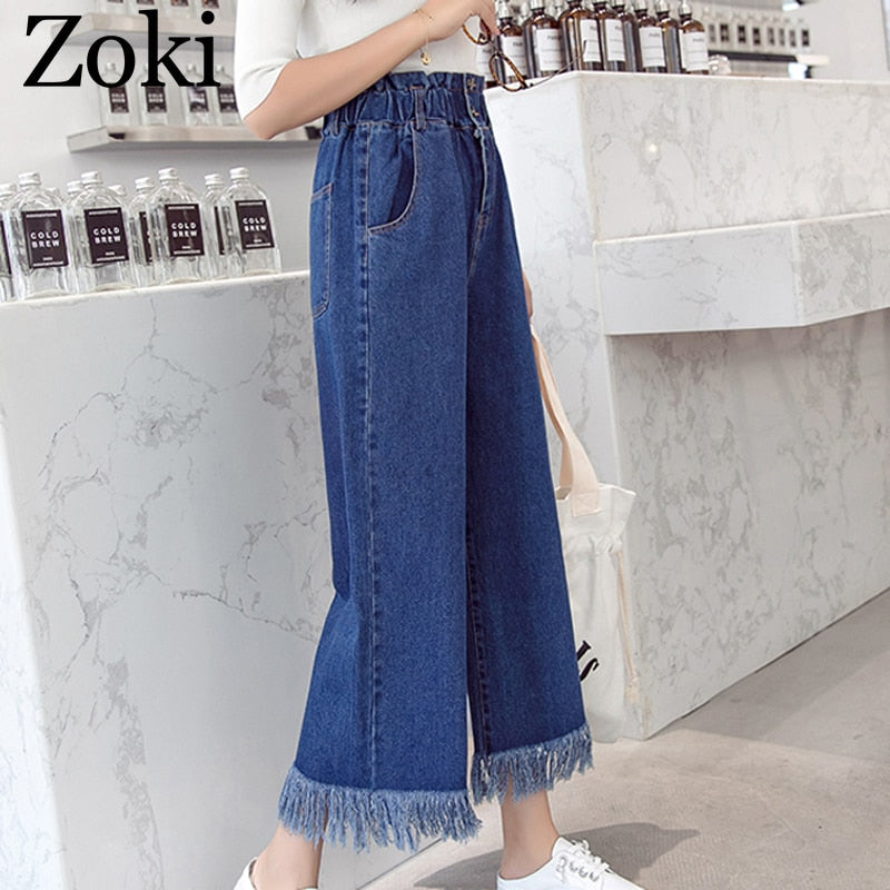 Zoki Spring Plus Size Women Jeans Tassel High Waist Elastic Ankle-Length Denim Pants Fashion Loose Wide leg Female Jeans S-5XL