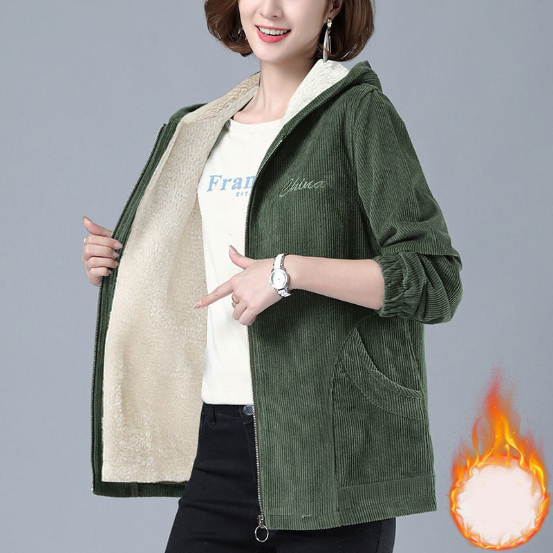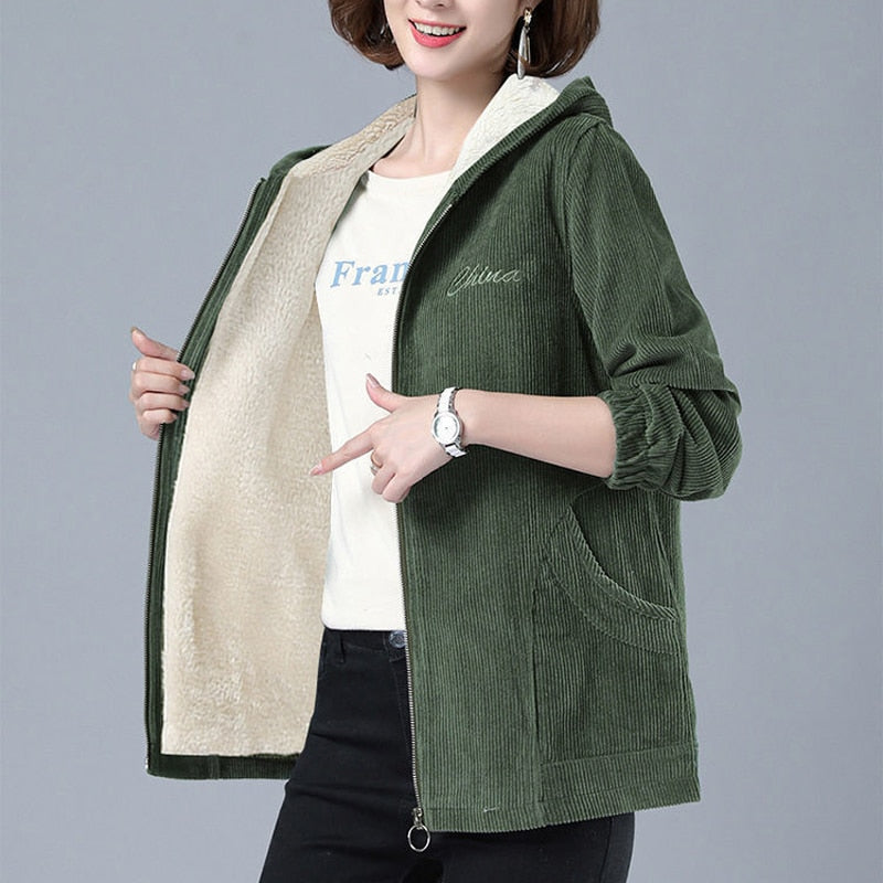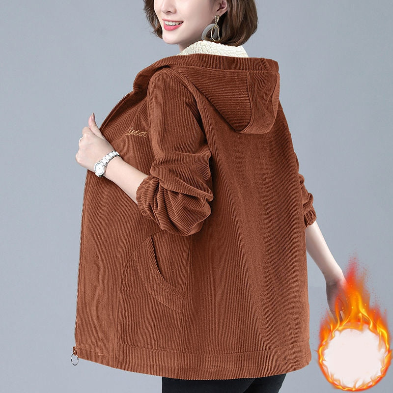 Zoki Warm Women Corduroy Coat Winter Thick Vintage Plus Size Pocket Zipper Female Jacket Hooded Loose Long Sleeve Lady Clothes